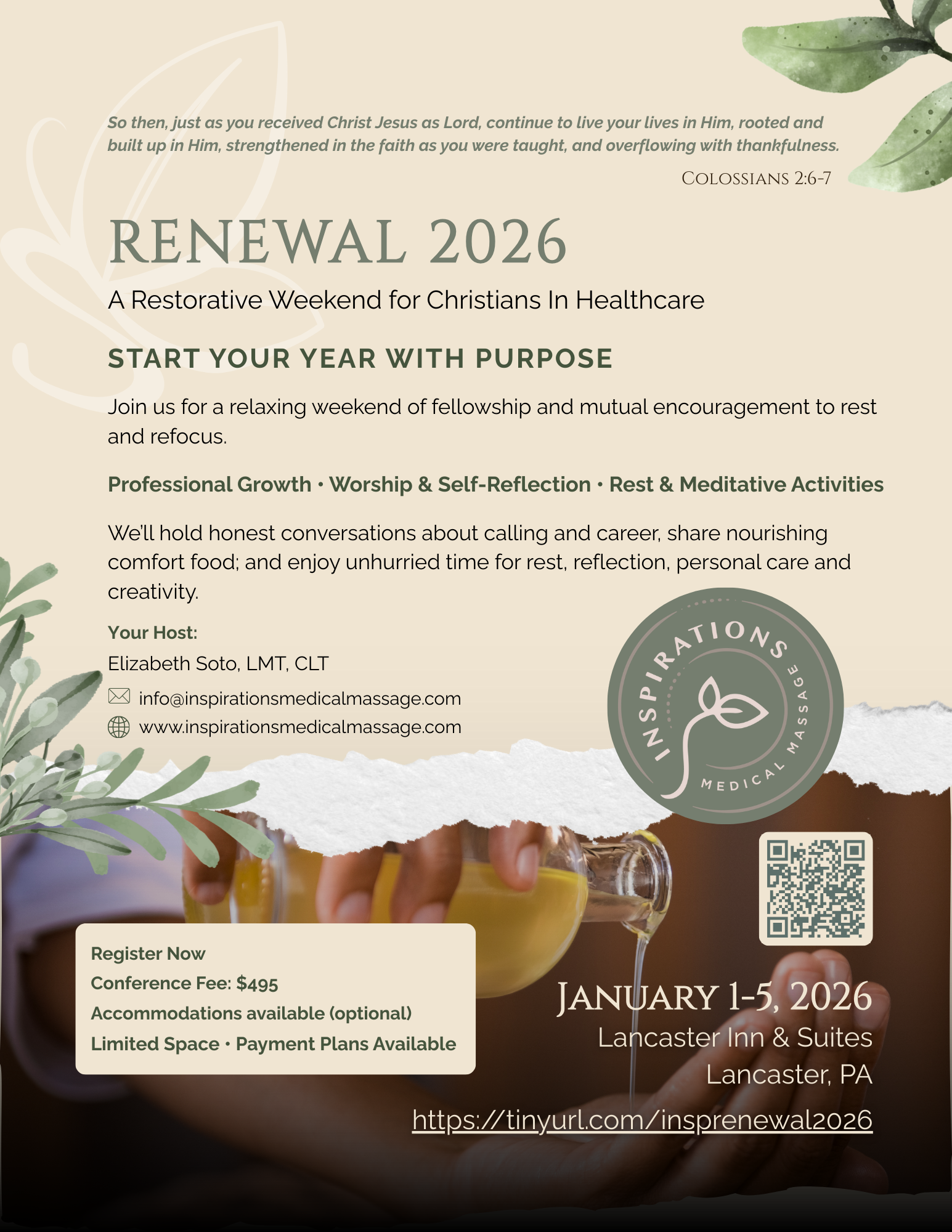 This is a faith-based weekend for massage therapists and healthcare workers who want to begin the year with intention, faith, and community. Let's rest, refocus, and encourage one another as we start the year together.